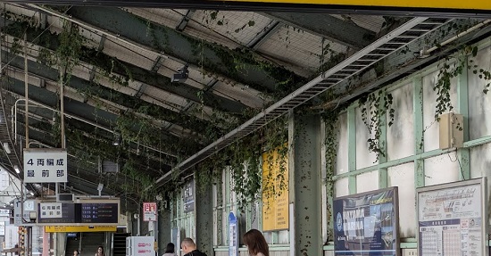 京浜急行の逗子葉山駅のホームは、緑のカーテンが下がっています。 8月に見た時より、さらに緑の範囲が広がったように見えます。 外からツタが入り込んでいるようです。